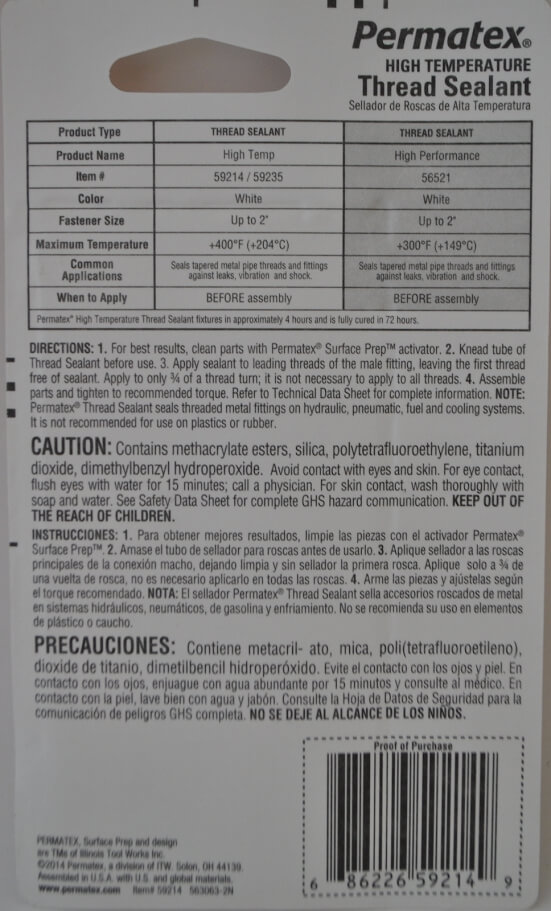 Герметик для фитингов высокотемпературный Permatex® High Temperature Thread Sealant выдерживает вибрации, ослабление в трубном соединении. Предотвращает утечку влаги, гидравлической жидкости и дизельного топлива. Белый герметизирующий состав с содержанием тефлона, обладает высокими смазывающими качествам, препятствующими образованию задиров.