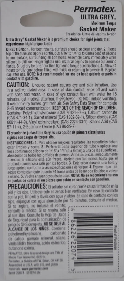 Силиконовый формирователь прокладок Permatex® Ultra Grey® Rigid High-Torque RTV Silicone Gasket Maker повышенной прочности и упругости. Рассчитан для использования во фланцевых соединениях двигателя с близко расположенными друг от дуга болтами, где требуется значительное усилие затяжки. Позволяет сформировать, непосредственно по месту высоконадежную прокладку толщиной до 6 мм. Обладает уникальной устойчивостью к маслам и антифризам, не повреждает датчики и не вызывает коррозии. Имеет широкий рабочий диапазон от -54 0Сдо +232 °С (кратковременно до +260 0С). Разрабатывался под ТУ японских и корейских автопроизводителей. Включен в спецификации автозаводов Тoyota, Nissan, Honda, Acura, Mitsubishi и Hyundai, как рекомендованный ремонтный продукт. Для профессионального использования выпускается расфасованным в картриджи по 300 мл и тубы с автоматической подачей.